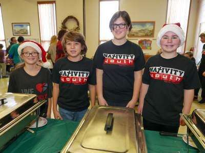 Members of St. Michael of the Nativity Lutheran Church had a Breakfast with Santa Dec. 10. With lots of activities for children as well as breakfast, the church saw a large turnout to support its outreach programs. Ready to serve are Nativity Youth Group members Cloie Hummel, Ryan Sigafoss, Emily Ramsey and Ryan Glose.PRESS PHOTO BY LOU WHEELAND