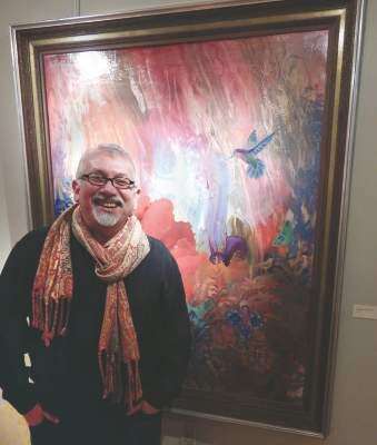 “Paradise Garden No 1” (oil on canvas) provides a colorfully pleasant environment with a hummingbird in flight that is joined by a butterfly and other birds among the lush vegetation.