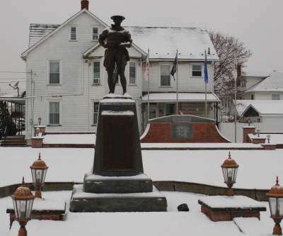 PRESS PHOTOS BY AL RECKERAbove: The World War I Doughboy soldier at Northampton Veterans Memorial Plaza, Washington and Dewey avenues and 14th Street, is covered in snow last Thursday as early-morning ice and a light snow arrived in the Lehigh Valley.
