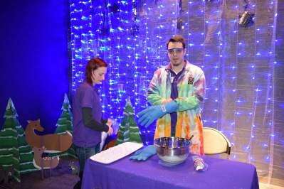 Marshmallows doused with liquid nitrogen become crunchy, according to Da Vinci Science Center employees, Peter (dressed as a scientist) and his assistant, Jess, Dec. 30, 2016, during Frozen Science Week.PRESS PHOTOS BY JENNIFER BODISCH