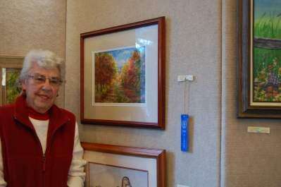 Jill Stanley's watercolor “Walk Along the Canal” is admired by her mother Doris Betzenberger of Slatington.