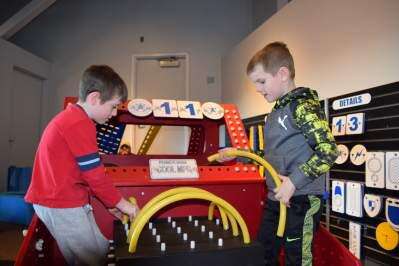 PRESS PHOTO BY JENNIFER BODISCHFriends Bryce Custer and Billy Forte, both 6, from Schnecksville, spent their day off from school for Martin Luther King Jr. Day at the Da Vinci Science Center. The boys jumped inside this giant truck, connecting plastic tubes to pegs on a simulated engine.