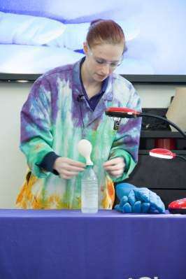 PRESS PHOTO BY LOU WHEELANDJessica Minor, museum educator, shows the audience how liquid nitrogen's super cold properties (-320° F) reacts with different materials using a balloon during a Super Coolness demonstration Jan. 15 at the Da Vinci Science Center, Allentown. Copyright - Lou Wheeland Photography