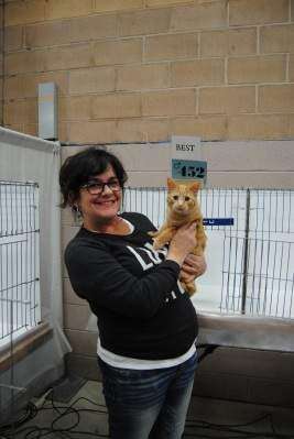 PRESS PHOTOS BY SUSAN BRYANTNichole Lang of Maumee, Ohio, is all smiles as she holds her 6-month-old kitten, Merlin, a golden tabby, after he won Best of Show in the Household Pet category for kittens at the Lehigh Valley Pet Expo Jan. 29 in the Agri-Plex at the Allentown Fairgrounds, Allentown.