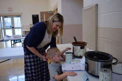 PRESS PHOTOS BY JENNIFER BODISCHYou're never too young to vote ... for your favorite soup that is! Evan Keefer, 3, of Schnecksville, places a coin in the can Feb. 5 for his favorite with the help of Cathy Smith of New Ringgold. Smith organized the soup and dessert contest at Union Lutheran Church, Schnecksville.