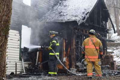 PRESS PHOTO BY JENNIFER BODISCHVolunteer firefighter Logan Noll and Lt. Matt Desch of Laurys Station Fire Company work to extinguish debris that rekindled just before 9:45 a.m. Feb. 15 at 1806 Rockdale Road, North Whitehall Township. The former Rockdale Hotel, now a three-story residence, was destroyed by a fire reported at 6:45 p.m. Feb. 14.
