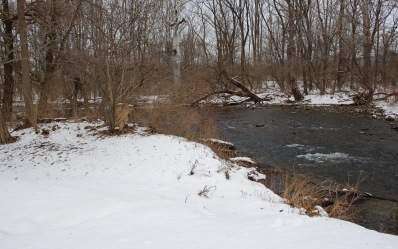 Snow settles on the banks of Hokendauqua Creek, Northampton, last Thursday afternoon. Wintry weather arrived overnight, making for tricky morning travel. In all, about 7 inches covered the area. The weekend rain has washed much of it away.PRESS PHOTO BY AL RECKER