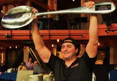 Right: People's Choice winner Michael Dontas, of Bethlehem, holds up the Souper Bowl Champion Spoon. The award was presented as the finale of the Souper Bowl at the ArtsQuest Steelstacks, selected by a vote of annual event's attendees. Dontas is a co-owner of the Copperhead Grille on Airport Road, Hanover Township. Souper Bowl VIII attracted 400 patrons to the ArtsQuest Center Jan. 28. The soup