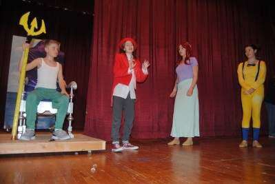 PRESS PHOTO BY SUSAN BRYANTMax Wetherhold, of Northampton, as King Triton; Pandora Schoen, of Lower Macungie Township, as Sebastian; Megan Brenkert, of Upper Macungie Township, as Ariel; and Maci Pollitt, of Whitehall, as Flounder, rehearse a scene from the musical “The Little Mermaid Jr.,” to be performed 7 p.m. Feb. 16 and 18 and 2 p.m. Feb. 19 in the Kline Auditorium at JCC of the Lehigh Valley