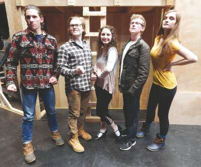 PRESS PHOTO BY ED COURRIERMoravian Academy's “Urinetown” lead characters, from left: Garrett Richards (Officer Lockstock), Jack Michaelis (Bobby Strong), Logan Kelly (Hope Cladwell), Jon Riker (Caldwell B. Cladwell) and Charlotte Bloys (Penelope Pennywise). Copyright - &Copy; Ed Courrier