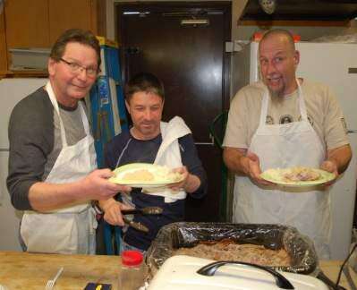 PRESS PHOTOS BY AL RECKERThis happy crew of chefs, from left, “Newby” Newhard, “Nut” Szerencsits and “Cotton” Barna, are busy cooking for guests at a pork and sauerkraut dinner, held Feb. 18 at Alliance Fire Company, Northampton.