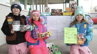 PRESS PHOTOS BY LINDA ROTHROCKGirls Scouts from Troop 6955, which meets at St. Paul's Lutheran Church, Catasauqua, appealed to customers outside the Pet's Supply Plus store, Whitehall, Feb. 5. Each cookie package featured an Atlanta Falcon or New England Patriot helmet, as customer purchases decided “who will win today's cookie bowl.” From left are Lilly Peluszak, Arianna Attieh and Ava Peluszak.
