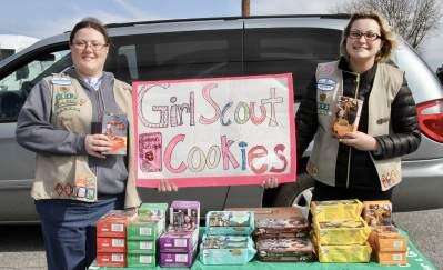 PRESS PHOTOS BY LINDA ROTHROCKAn unseasonably warm Feb. 19 afternoon helped boost cookie sales for Ashley Ziegenfuss and Britney Bankos, who sold the treats outside Kotsch's Market on Fullerton Avenue, Whitehall. Both girls are members of Troop 6942, which meets at Faith Evangelical Lutheran Church in Whitehall.