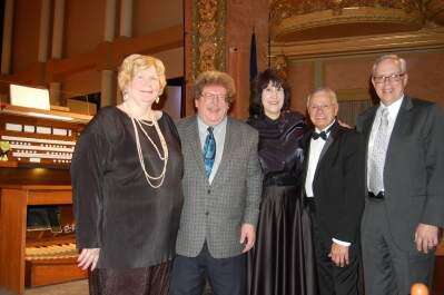Celebrating the “Symphonic Organ Festival” at the conclusion of the March 11 Allentown Symphony Orchestra “Classical Series” concert program at Miller Symphony Hall are, from left, Sheila Evans, Allentown Symphony Association Executive Director; Eric Ewazen, composer, “Concertino for Organ and Orchestra”; Diane Wittry, Allentown Symphony Orchestra Music Director-Conductor; Hector Olivera, organist for the program, and Barry Holben, Vice President, Sales, Allen Organ Company, which commissioned the Allentown concerts’ world premiere of the Ewazen “Concertino” and provided the 58-stop, three-manual Bravura Organ (seen in the photo) built by Allen Organ in Macungie, Lehigh County. The program was also presented March 12 at the hall. The organ festival concluded the symphony-sponsored March 5-10 “Organ Extravaganza” held in the Lehigh Valley.