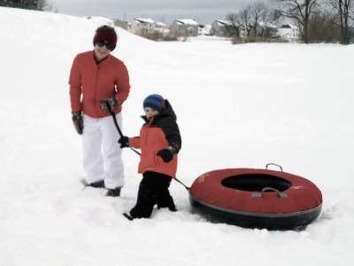 PRESS PHOTOS BY AARON BERGER Bohden Pasko, 3, of Upper Macungie Township, enjoys his snow day off from school March 14 pulling his inner tube up a hill with his mom, Holly, to take a ride down the hill. Copyright - COPYRIGHT, 2010