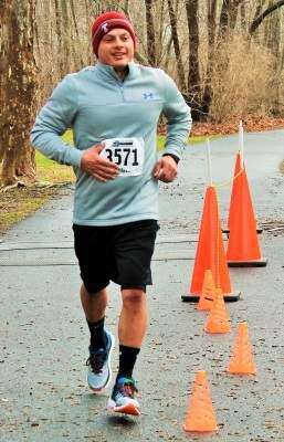 PRESS PHOTOS BY TINAMARIE MARTINLeft: Carlos Rivan, of Whitehall, crosses the finish line during Pediatric Cancer Foundation of the Lehigh Valley's eighth annual 8K run/5K walk, held Saturday on the Ironton Rail Trail.
