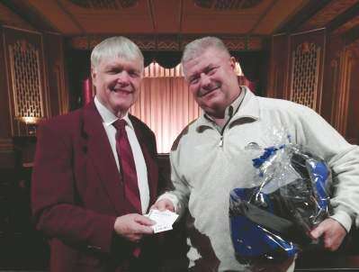 PRESS PHOTO BY ED COURRIERRoxy Theatre owner Richard Wolf, left, presents the “Readers Pick the Oscar Recipients” prize package to Robert Ferenchko, right, inside the venerable movie house located along Main Street, Northampton. Ferenchko correctly picked seven out of eight winners in the contest categories for the 2017 Academy Awards and had the earliest submission date for his entry. His prize Copyright - &Copy; Ed Courrier