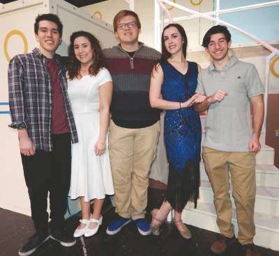 Allentown Central Catholic's production of “Anything Goes” include cast members, from left, Matt Lo (Billy Crocker), Jocelyn Lengen (Hope Harcourt), Sam Brown (Moonface Martin), Abby Garza (Reno Sweeney) and Noah Millheim (Lord Evelyn Oakleigh). Copyright - &Copy; Ed Courrier