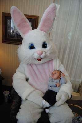 PRESS PHOTO BY SUSAN BRYANTKillian Sicher of Slatington, 7 weeks, isn't quite sure what to make of the Easter Bunny. The infant visited The Neffs National Bank, Neffs, with his mom and grandmother as the bank was celebrating Community Banking Month. Helping the Easter Bunny was Harold Reitz.