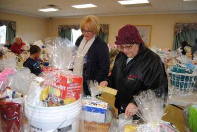PRESS PHOTOS BY SUSAN BRYANTMarian Bassler of Harrisburg checks out a basket as she waits for her cousin Christine Lenhart of New Tripoli to place a ticket in one of the cans at the Northern Valley Ambulance Ladies Auxiliary basket social April 1 at their Ormrod headquarters. Lucky Christine won several baskets at the social.