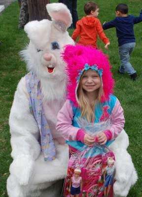 Below: These happy Coplay kids - from left, Mackenzie Miley, Alex Hilson and Madelyn Miley - take a break to have a sweet snack after Coplay Recreation & Welfare Association's annual Easter egg hunt, held Saturday on the lawn of St. Peter Roman Catholic Church. Left: Courtney Molnar, of Coplay, is all smiles for her photo with Roger Rabbit during the holiday event.PRESS PHOTOS BY AL RECKER