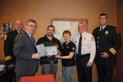 PRESS PHOTO BY SUSAN BRYANTSouth Whitehall Emergency Management Coordinator Jeff Kelly, Cetronia Ambulance Corps Operations Director Chris Peischl, Cetronia Fire Chief Jay Heicklen and South Whitehall Police Chief John Christman presented (third from left) Adam N. Nowicki, Pa. division trainer and asset protection and security, and Bonnie Fisher, service area manager, both with Wegmans, with