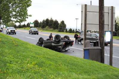 PRESS PHOTOS BY SUSAN BRYANTTwo South Whitehall Township police officers discuss the early morning crash as a dark-color SUV rests on its roof in the 3500 block of Hamilton Boulevard as two police SUVs block off the area to traffic.