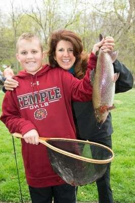 Kale Kumernitsky, 10, a Parkland School District student, proudly holds high his winning rainbow trout. Showing her support is South Whitehall Township Board of Commissioners President Tori Morgan.Press photoS by LOU WHEELAND Copyright - Lou Wheeland Photography