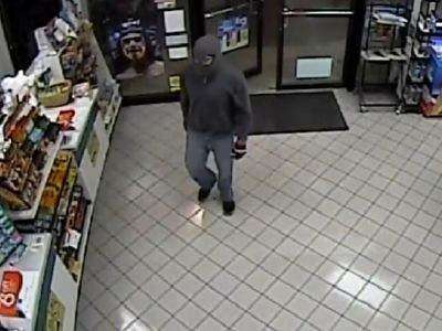 The suspect is described as a Caucasian male approximately 5 feet 7 inches tall weight approximately 130-140 pounds with a gray mask and sweater.