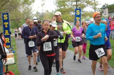 Runners at the eighth annual Trot for Tykes 5K, organized by Lehigh Valley Steel Force, Whitehall Township, begin their race April 22 on the Ironton Rail Trail, with its base at the American Club of Coplay pavilion. This benefit for children with special needs provides custom-made trykes and bikes.