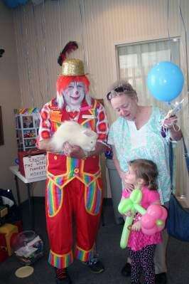 Making smiles ... and balloon flowersEmily Schafer, 3, of Slatington, smiles brightly up at PitStop the Clown and his bunny April 28 at The Neffs National Bank Community Banking Month celebration. Her grandmother Tona Roeder of Slatington brought Emily to the bank where PitStop made the flower balloon the youngster is holding.PRESS PHOTO BY DEBRA PALMIERI