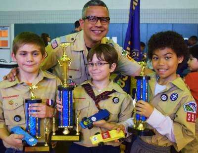 PRESS PHOTOS BY TIM GILMANJimmy J. Torres, Scoutreach district director, congratulates the fastest racers in the derby: Matthew Neuman (3rd place) of Pack 102 at Sheridan ES in Allentown, Joseph Templeton (1st) of Pack 397 at Holy Infancy School in Bethlehem and Averic Teague Padilla (2nd) of Pack 391 at Lincoln ES in Bethlehem. Additional awards were also presented in a variety of categories.