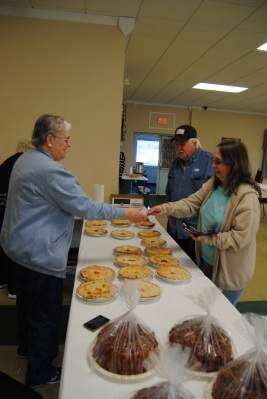 Above: Cindy Kish of Coplay purchases two sandwiches from Northern Valley Ladies Auxiliary member Cathie Mlynek during the ladies auxiliary soup, sandwich and baked goods sale on Municipal Primary Day. Left: Northern Valley Ladies Auxiliary member Marlene Hoffman accepts payment from Joseph Rusenko and Judie Pocze of Schnecksville for their two pies, a cherry and blueberry, during the soup,