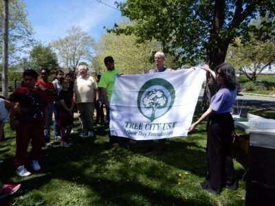 Fountain Hill Shade Tree Commission members Jason Quarry, Mike Klo and Suzanne Poroszlai hold the flag presented by the State Forester John Nissen. “Arbor Day is a different day than any other holiday,” Nissen told the gathering. “Other holidays celebrate the past, but Arbor Day is a celebration of the future.”