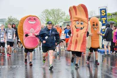 More than 90 entrants enjoyed a rainy start with help from the IronPigs “Pork Racers.”