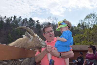 PRESS PHOTOS BY JENNIFER BODISCHAt first a little scared, but with the help of his Grandpa Bob, Grayson, 2, can't help but laugh out loud as his grandpa feeds a goat. The entire family, along with the grandparents, traveled from Stroudsburg recently to spend a day together at Lehigh Valley Zoo.