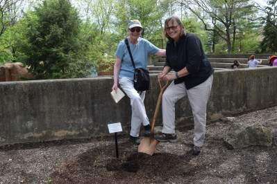 PRESS PHOTOS BY JENNIFER BODISCHLinda Freedman and Barbara Allerton planted several bushes and trees in loving memory of Viola and George Allerton during the recent Parkland Garden Club Arbor Day Celebration at the Lehigh Valley Zoo.