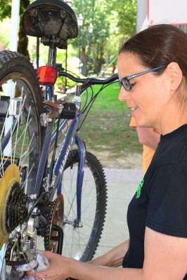 PRESS PHOTOS BY DANA GRUBBCutters Bike Shop owner Lisa Ronca oils the gears on a bicycle used by a Bike to Work Week participant. Cutters was an event sponsor and is one of two locations where bikes may be rented for free under the Bike Bethlehem program.