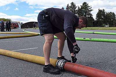 PRESS PHOTO By DANA GRUBBBethlehem firefighter James Sprague torques a connection on a 5 inch supply line in the Memorial Pool parking lot as part of the Bethlehem Fire Department's annual test on hoses, according to Lt. Scott Priestas. The supply line is used to deliver water from the hydrant to the pumper. Smaller hoses are used by firefighters to actually battle a blaze.