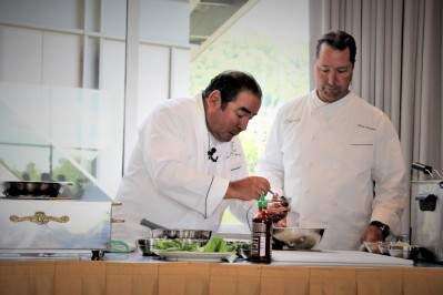 Before starting the next dish, Lagasse shared some knowledge about the chemistry of cooking. “When you have evaporation, you have concentration [of flavors]. Lids help you trap evaporation.” In other words, if you want reduction or a thicker, more flavorful sauce, use evaporation. If not, keep the lid on.