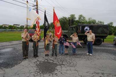 PRESS PHOTOS BY SUSAN BRYANTBoy Scouts Michael Prebosnyak with Troop 72, Trey Wachob, Josh Jones and Isaac Wachob, all with Troop 71, present the colors at the Memorial Day ceremony at the Robert M. Fegely VFW Post 8282, Breinigsville.