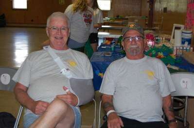 Press photos by Elsa KerschnerBill Kearns and Charlie Hughes, fire company trustees, greet people as they enter the social hall.