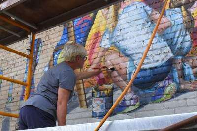 Holly Fields-Scott of Bella Pintura Inc. is working on the mural, which she says “celebrates diversity of the community” and which should be finished by the end of July. After the brick exterior wall received repairs, Fields-Scott was spotted outlining and painting the mural with her daughter, Nevada’s, assistance on June 23. Their work will continue to the end of July she estimates.