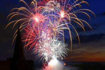 Fourth of July in Bethlehem concluded with the city’s traditional fireworks display. Launched from the centrally located Sand Island along the Lehigh River, the pyrotechnics give residents many vantage points from which to enjoy the sounds and colorful bursts as the nation celebrates its independence. This view is from St. Michael’s Cemetery.