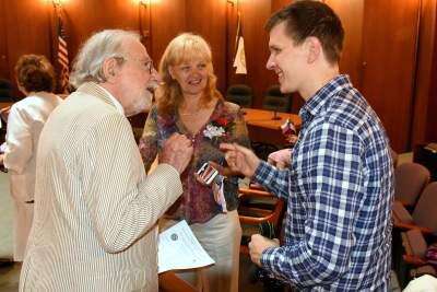 PRESS PHOTOS BY DANA GRUBBStephen Antalics Jr. chats with Vesna and Amir Kolmanic prior to the ceremony. Antalics, founder of the Bethlehem-Murska Sobota Sister Cities Association, filled in as master of ceremonies for president Gene Novak, who is recovering from an accident. The Kolmanics are the wife and son of guest speaker Vladimir Kolmanic, deputy chief of mission at the Republic of Slovenia Copyright - &Copy; Ed Courrier