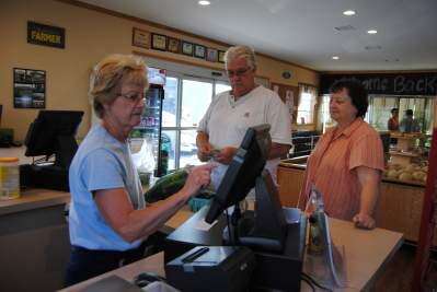 PRESS PHOTOS BY SUSAN BRYANTKaren Newhard rings up the purchase of Doug and Mary Egge of Allentown. The couple took home sweet corn and cherries June 30 from Newhard Farms Corn Shed, 3250 Mauch Chunk Road, Coplay.