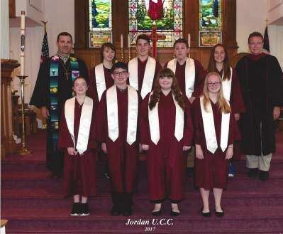PRESS PHOTO COURTESY OF JORDAN UCCTaking part in confirmation at Jordan United Church of Christ, South Whitehall, are Pastor Wally Frisch, Aidan Kontir, Bryce Agostinelli, Logan Leibenguth, Morgan Reidenhour, the Rev. Dr. David Charles Smith and (front) Savanna Becker, Austin Philhower, Mackenzie Tobia and Makayla Heintzelman.