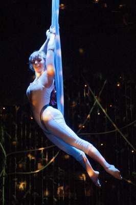 Ladders help simulate the monkeys climbing trees while also acting as useful means of assisting some of the more acrobatic performances. Rigs are raised and lowered from the ceiling, enabling aerial pieces to be played out, both for humor and amazement.