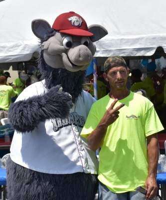PRESS PHOTOS BY JULIA FRITZClifford Moore, of Allentown, poses with FeRROUS, mascot of Lehigh Valley IronPigs, July 20 at Nazareth Pallet's seventh annual safety event. At the event, there were safety demonstrations and displays by fitness trainers, local medical facilities, Northampton Fire Department and Northampton Regional EMS.