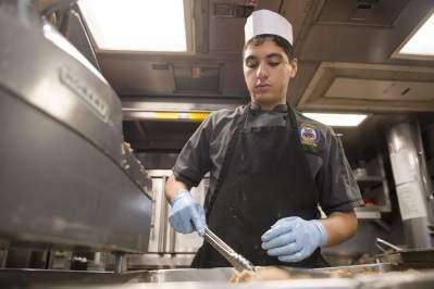 PHOTO COURTESY OF Brianna Green, mass communication specialist 3rd Class, U.S. NAVYCulinary specialist Seaman Karim Lino, of Whitehall, prepares dinner aboard the guided-missile destroyer USS Cole (DDG 67). Cole, part of the George H.W. Bush Carrier Strike Group (GHWBCSG), is deployed in the U.S. 5th Fleet area of operations in support of maritime security operations designed to reassure allies